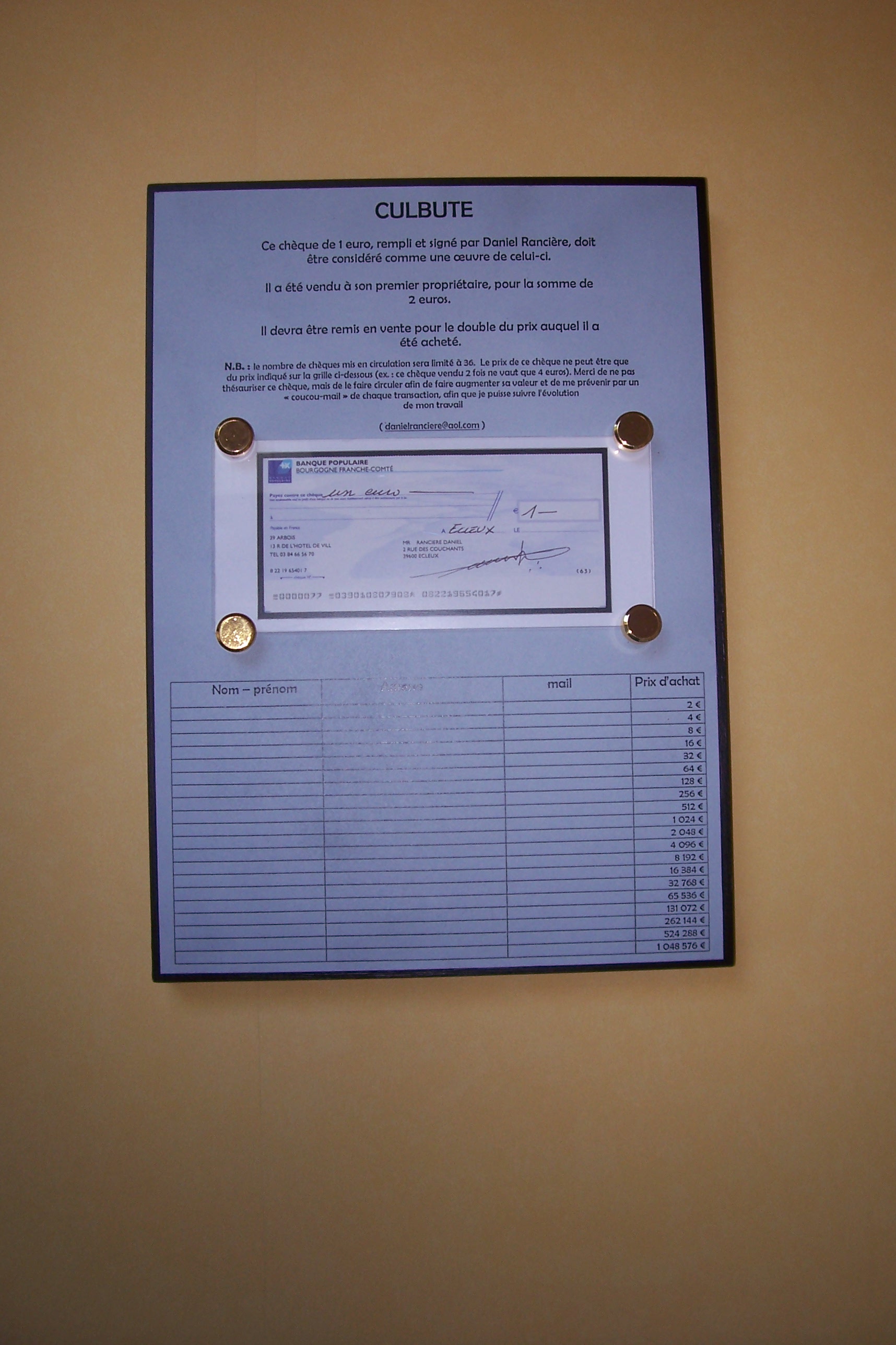 Métaphore du marché de l'art, Culbute transforme ses acheteurs en marchands, en spéculateurs. Certains ont le talent de faire croire qu'un chèque de un euro vaut beaucoup plus que sa valeur faciale.