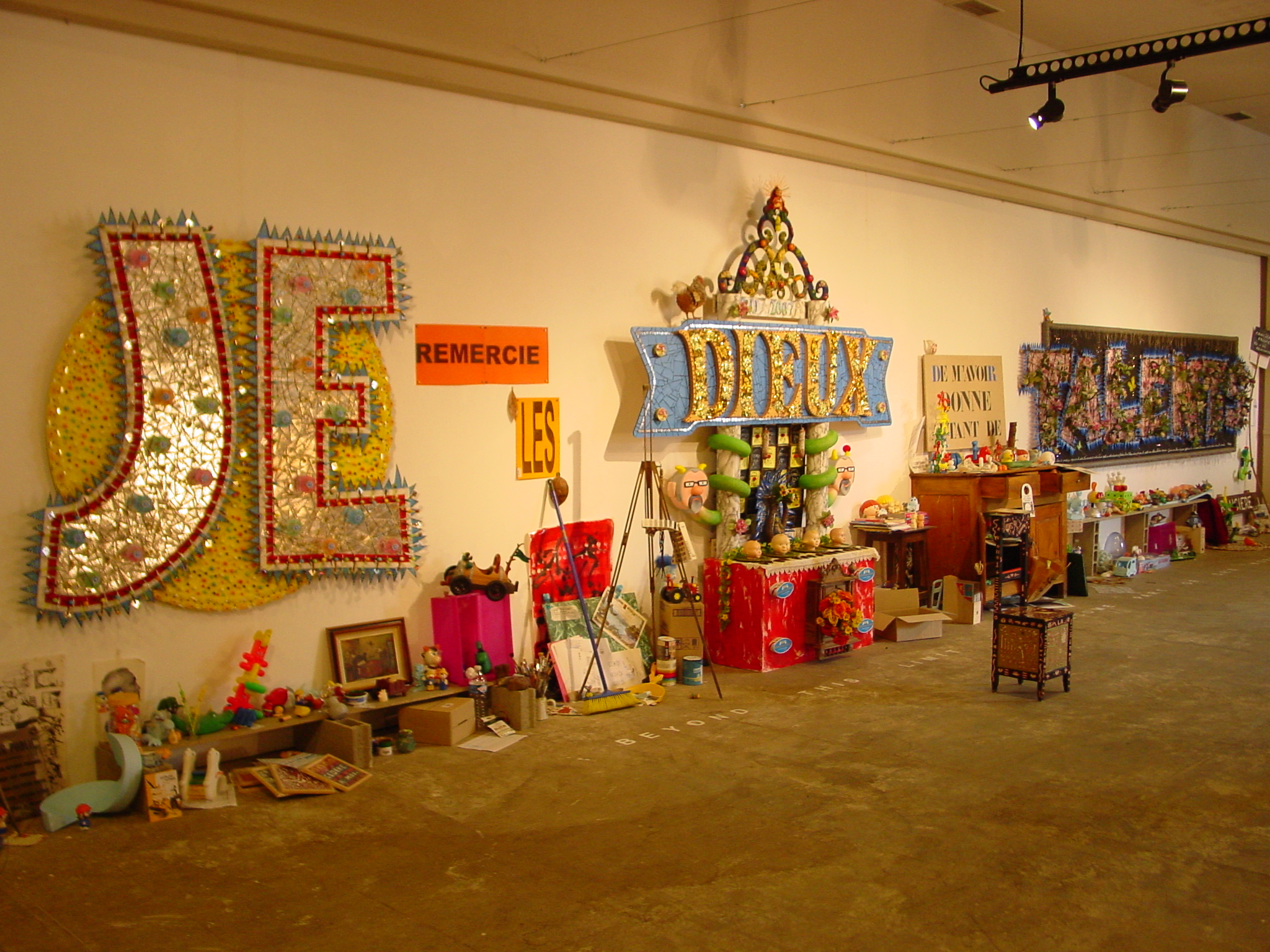 Réalisé en 2007, présenté à l'IUFM de Franche-Comté, d'une longuer de 13m, "Dieux merci!" est une exposition charnière où les assemblages se transforment petit à petit en installation.